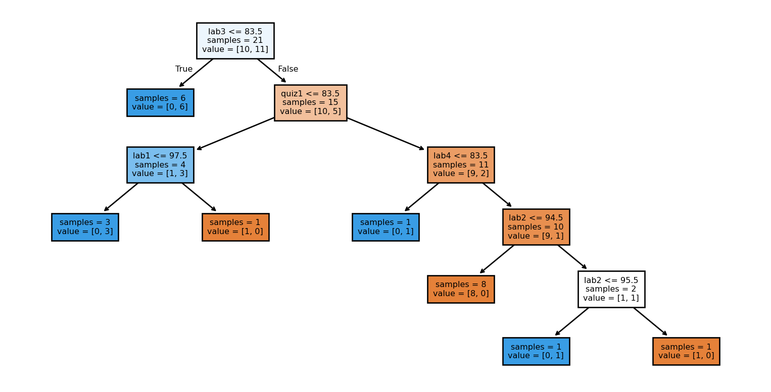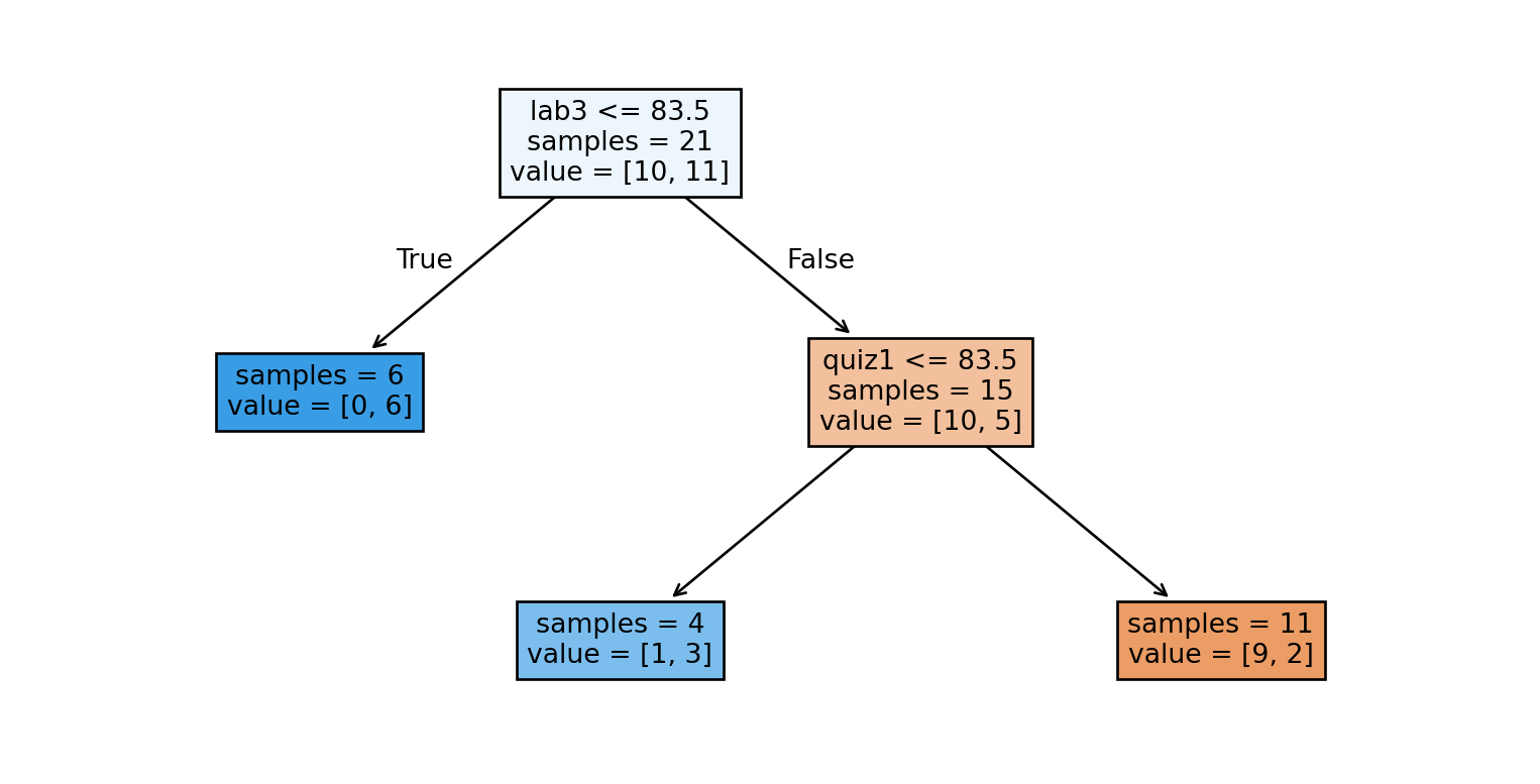 The first two questions in our tree involved Lab 3 and Quiz 1 grades. We can make a plot involving these two features to better understand our tree.